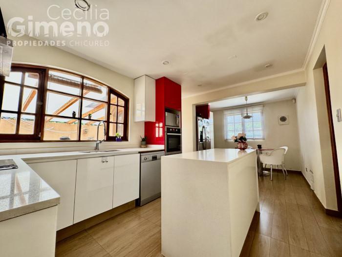 - cocina moderna amplia con mueble isla, espacio para comedor de diario, equipada con encimera-campana-horno