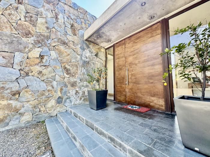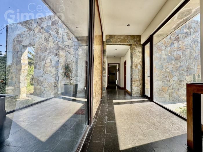 - amplio hall de entrada con muros de piedra y vista al jardín