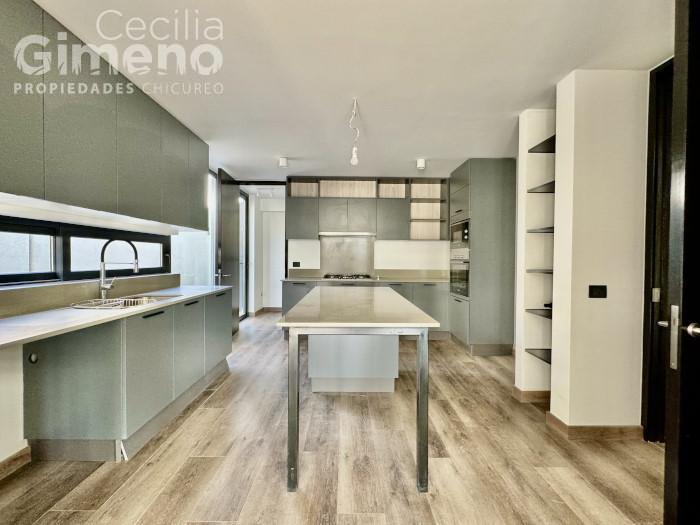 - cocina con puerta corredera, comedor de diario y mueble isla, equipada con encimera-horno-campana-microondas