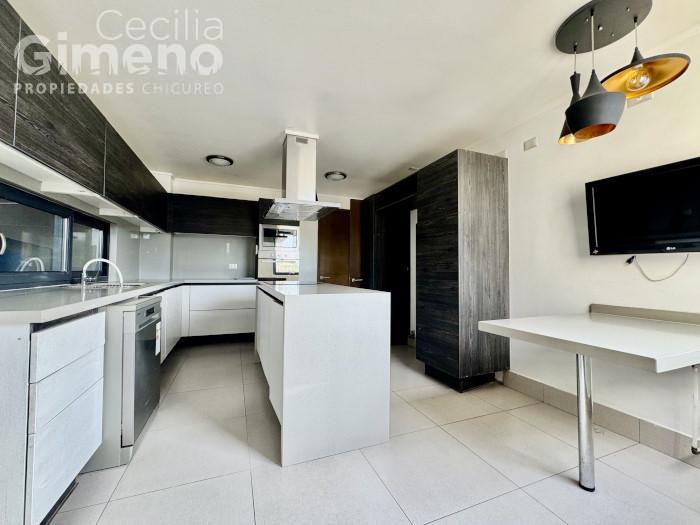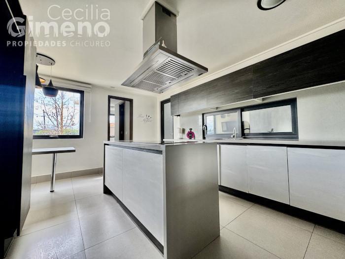- cocina con comedor de diario, mueble isla con encimera y campana, microondas y horno eléctrico